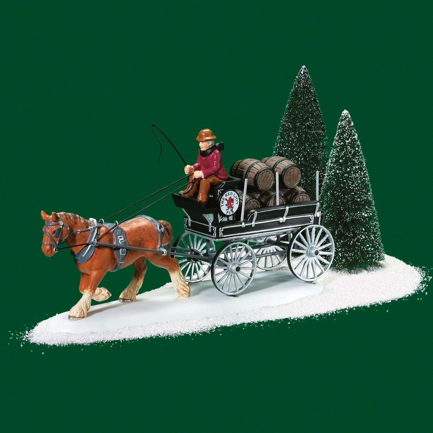 DESIGN: features a horse-drawn buggy loaded with a driver and beer kegs, made for display in your mini decorative Dickens’ Village!