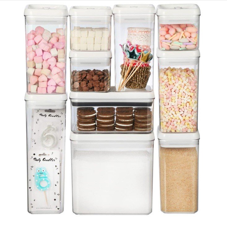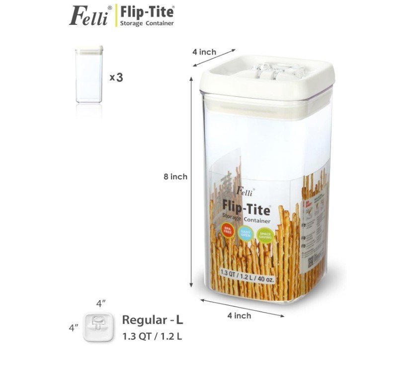 Felli Flip-Tite containers are available in multiple sizes and shapes to meet different storage needs. The 4-inch REGULAR and RECTANGULAR sizes are ideal for small pantry and countertop organization. The 5-inch LARGE size is suitable for items like sugar and beans that require scooping, while the 6-inch XL size is designed for bulk storage of rice, flour, and powdered foods that require measuring spoons.