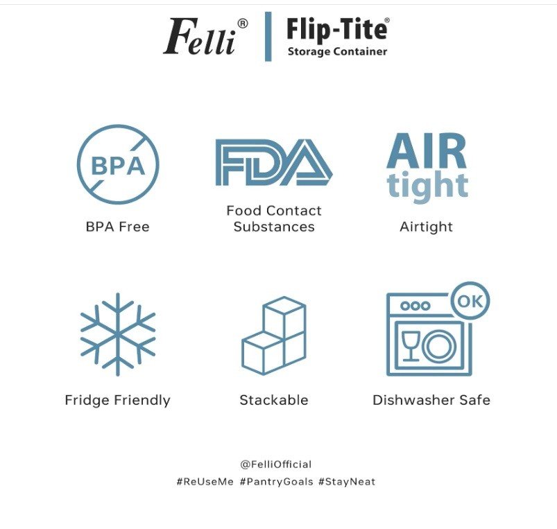 Felli Flip-Tite containers feature a patented flip lock lid with an airtight silicone seal that keeps food dry and fresh for extended shelf life. This eco-friendly storage solution helps reduce reliance on disposable packaging, minimizing waste and saving money over time.