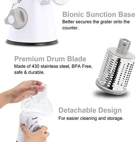 Subtle Design : The powerful suction base keeps the cheese grater firm on a clean or smooth counter-tops like marble, glass. Plus, the transparent barrel with an inclined curvature reduce jamming in the cheese shredder