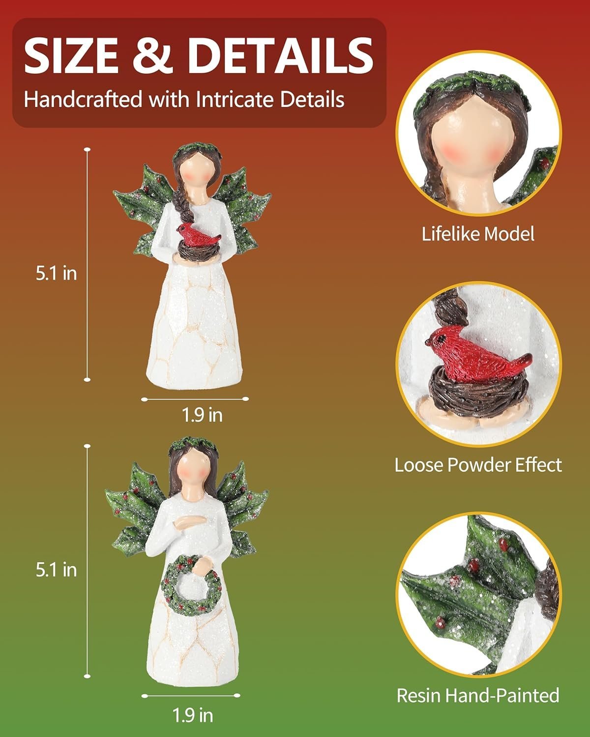 Thoughtful Details: One angel decor holds a red cardinal in her hands while the other cradles a green christmas wreath, adding a heartwarming touch to the intricate design.