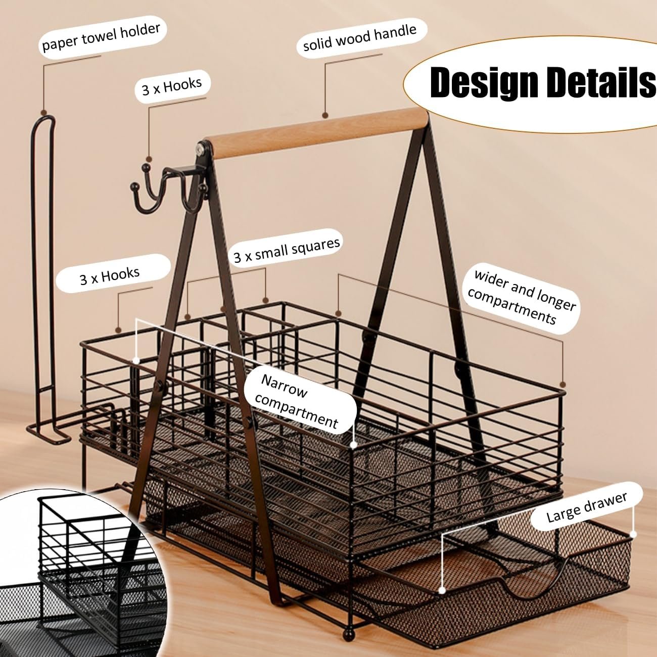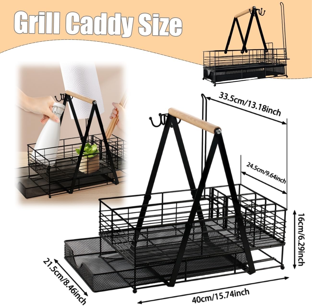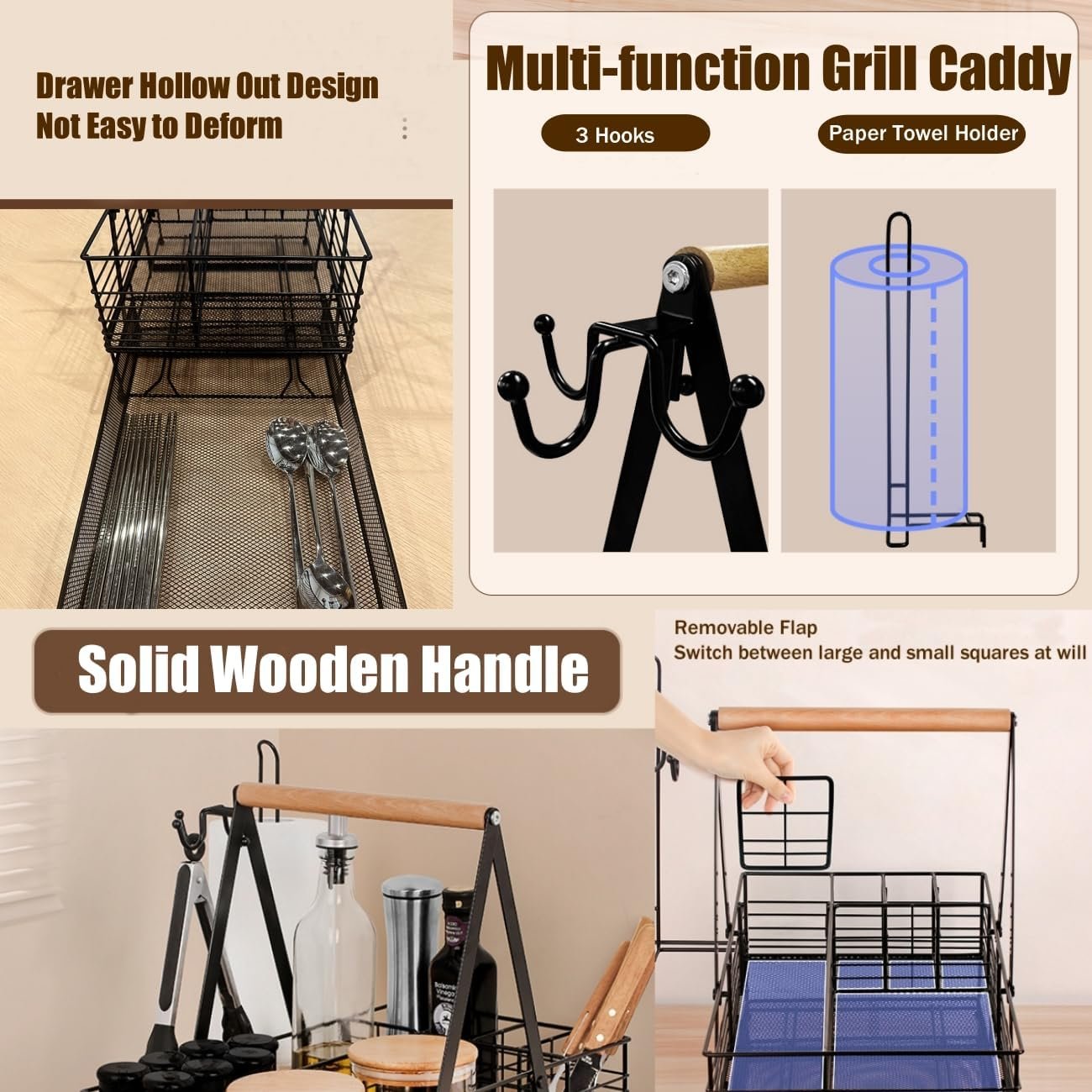 Enough Space: Barbecue caddy has 6 compartments with wooden handles designed for easy carrying, plus a paper towel roll holder and 3 hooks, large enough storage space for you to store all kinds of barbecue accessories, camping tools, condiments, grilling tools, spoons, cups and more.