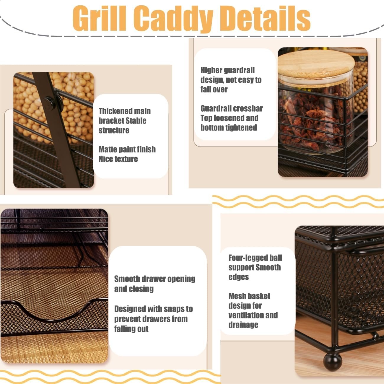 Heavy Duty and Sturdy Picnic Caddy: Outdoor Grill Made of heavy-duty stainless steel material, it can hold a variety of spices and grilling accessories. The bottom features a mesh design that facilitates the leakage of water droplets and makes cleaning easy. Adjustable compartments, change the position at will, very flexible.
