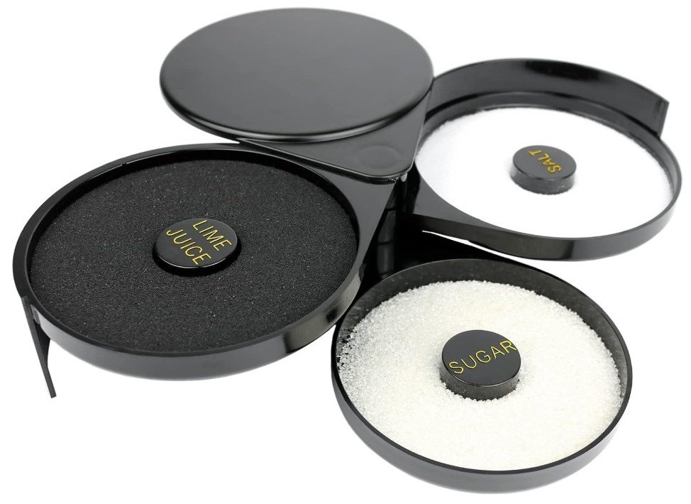 The lightweight, foldable three-layer construction saves space and keeps your bar area organized. Three clearly labeled compartments help prevent cross-contamination and allow easy identification and separation of salt, sugar, and lime juice.