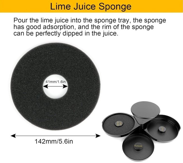 The built-in sponge evenly coats the rim with lime juice. Simply press the glass gently onto the sponge to create the perfect base for a salted or sugared rim.