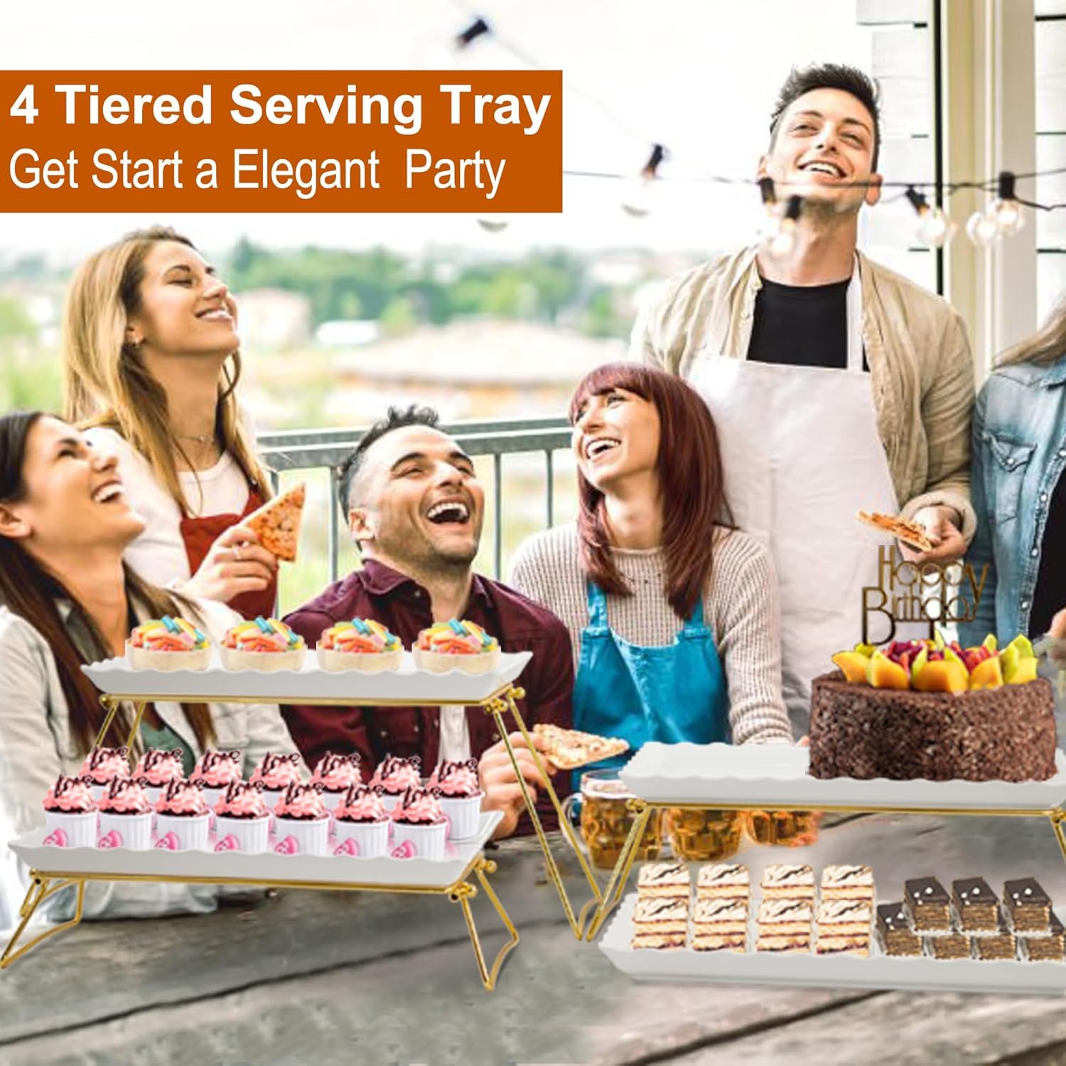 OUR BRAND: KAQAHIDO helps to provide excellent tray serving solutions for customers, offers a stylish display for dessert items, saves space for extra food, and makes a great addition to party table. Notes: Each of 1pcs golden tong and cleaning clothes are included in this 4 tier stand set. And do not use the food tray in the microwave