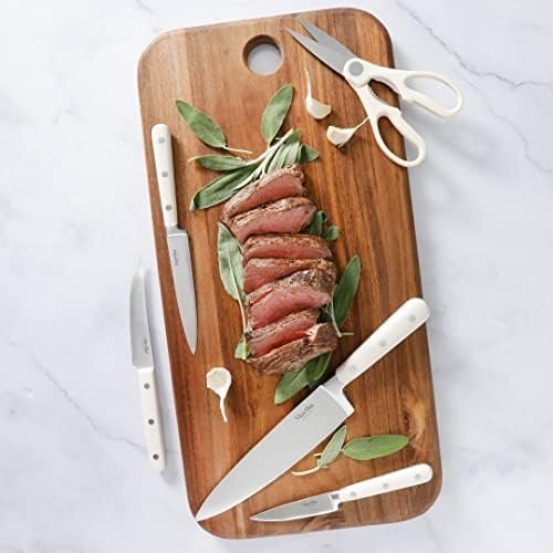 The Martha Stewart Everyday Eastwalk 14-piece Stainless Steel Cutlery Set offers all food prep essentials for home cooks at any skill level. Made from forged stainless steel with full tang construction, each knife ensures precise cuts and smooth food release. Ergonomic, triple-riveted handles have comfortable and balanced grips, perfect for dicing, mincing, chopping, and more. Store knives in the acacia wood knife block safely when not in use. Handwash recommended.