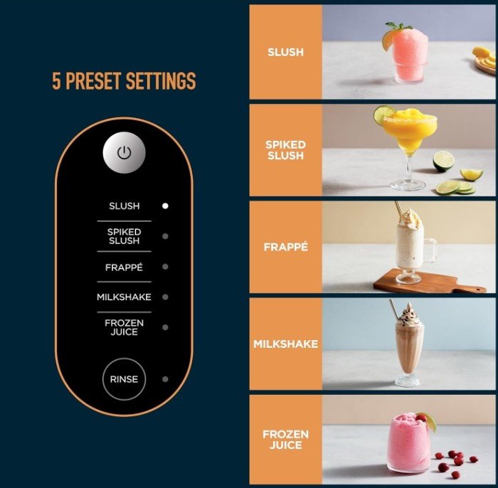 Transform a wide range of liquids into smooth, flavorful frozen drinks, including wine, coffee, soda, juice, chocolate milk, and more. Simply pour in your liquid, select a program, and watch it freeze to perfection.
