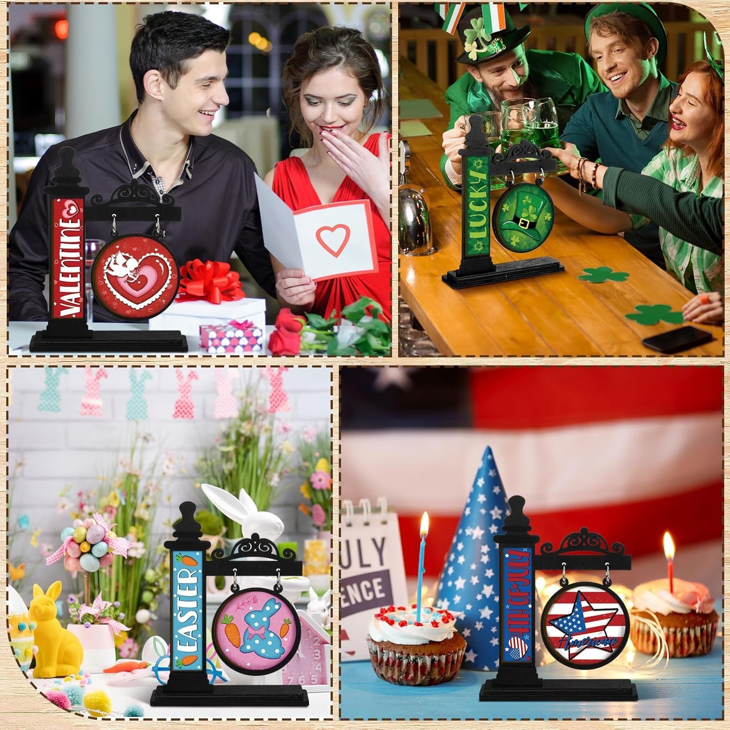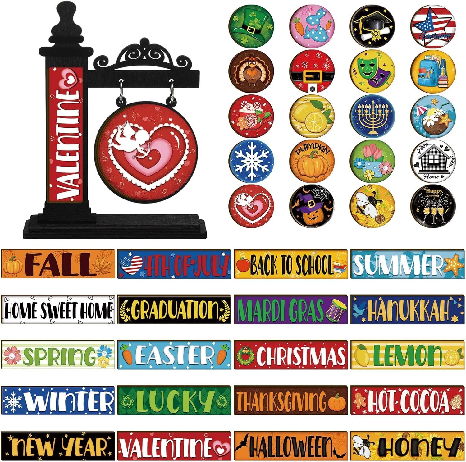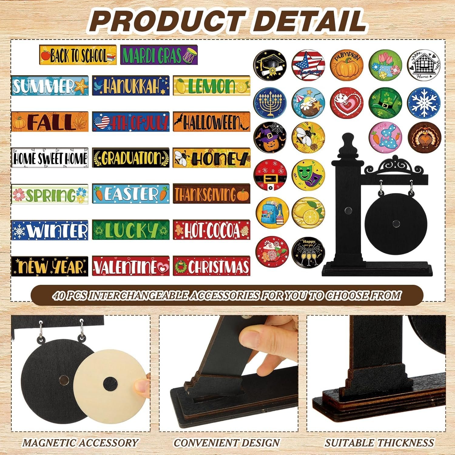 Versatile Interchangeable Decorations: embrace the change of seasons with our interchangeable seasonal mini standing sign; Crafted from wood, the set includes a base and 40 interchangeable seasonal signs, giving you the freedom to switch up your decorations to match holiday, Christmas, Valentine’s Day, St. Patrick’s Day, Easter, and more