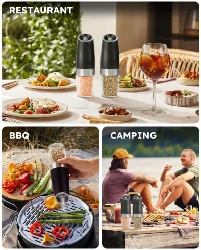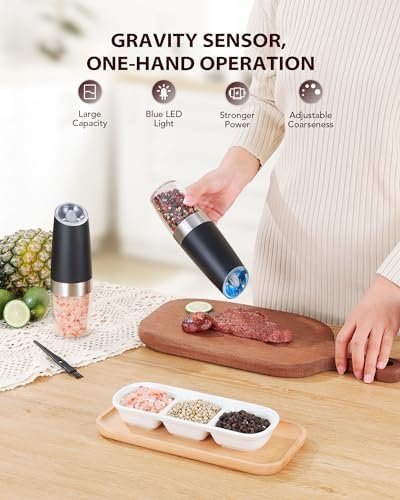 GRAVITY SENSING AUTOMATIC OPERATION – The gravity salt and pepper grinder set uses advanced gravity sensing technology to provide effortless one-handed operation. Simply flip the grinder over and enjoy freshly ground spices without grinding manually or pushing buttons. Each grinder requires 4 AAA batteries (not included). Present this battery operated set to friends or family as a Mother’s Day gifts Father’s Day gifts Christmas gifts–their kitchen isn’t complete without this electric grinder set