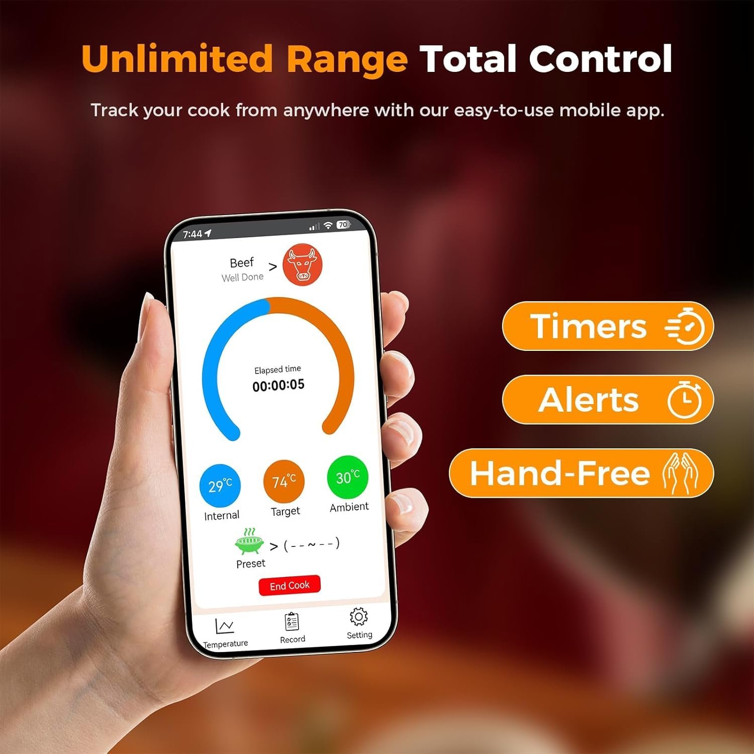📱 Intelligent App Control with Guided Cooking System Take the guesswork out of cooking. The digital meat thermometer connects to the free app, providing step-by-step guided recipes, customizable alerts, USDA doneness levels, and estimated finish times. Perfect for beginners learning to grill and for pros looking for consistent results.
