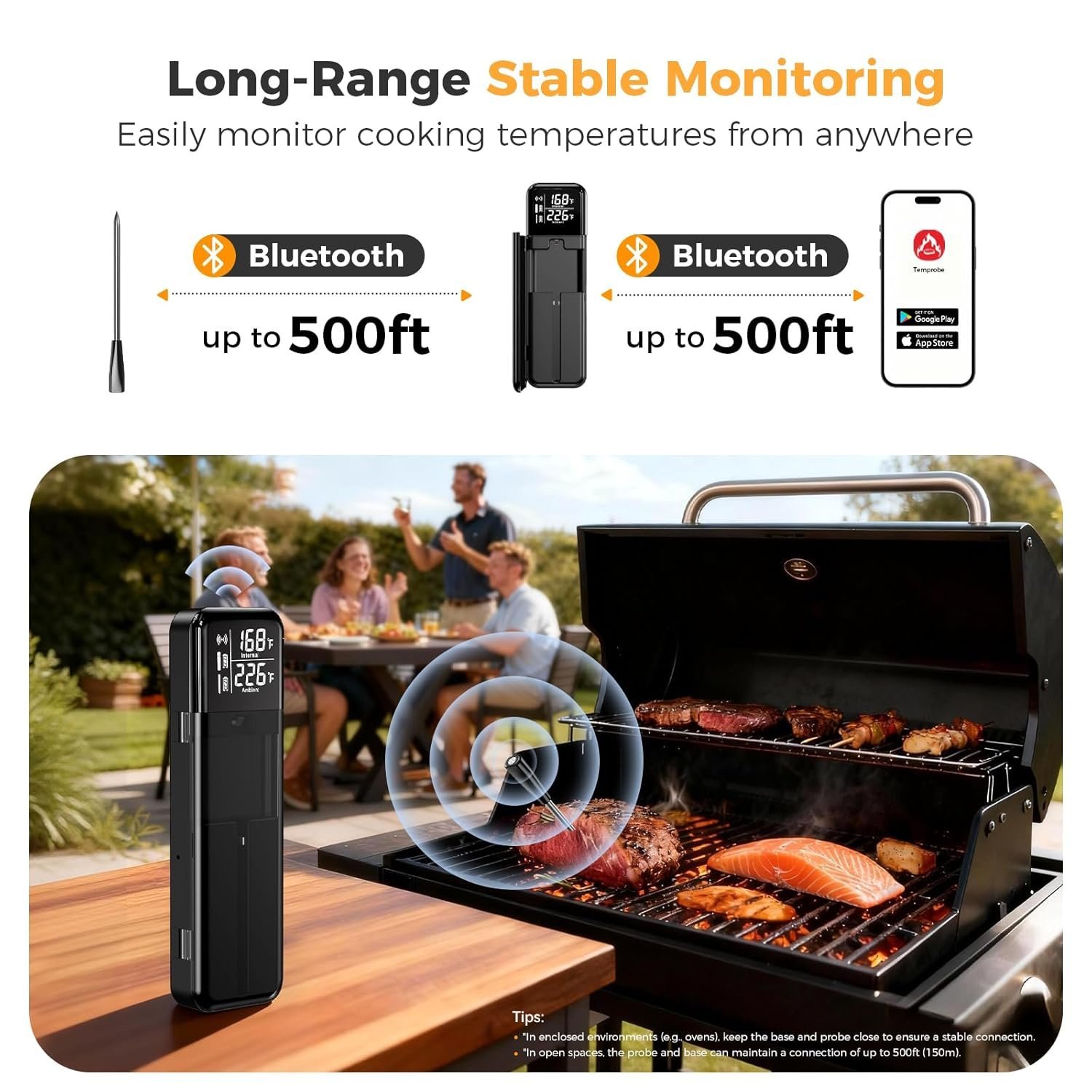 📶 Bluetooth 5.4 with Extended Range – True Wireless Cooking Freedom Upgrade your cooking with a Bluetooth meat thermometer that delivers a stable connection and extended wireless range thanks to the built-in repeater in the charger. Monitor your food in real time from the living room, kitchen, or backyard—ideal for oven, grill, smoker, or air fryer.