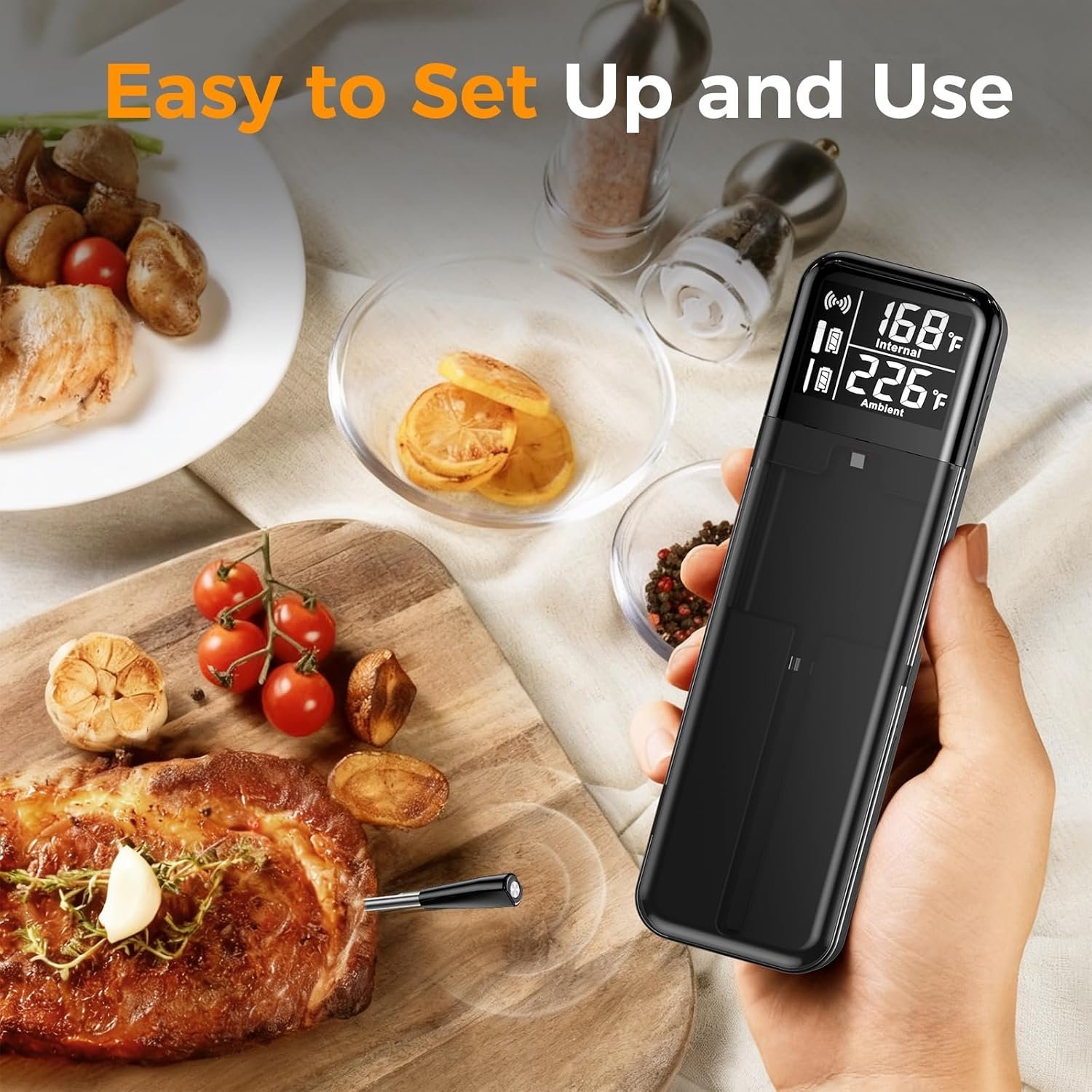 🌡️ Dual Sensors & High-Accuracy Probe – Precision at Every Degree This wireless meat thermometer features a ceramic heat-resistant probe with dual temperature sensors to measure both internal meat temp (up to 212°F) and ambient cooking temp (up to 527°F). Achieve steakhouse-level doneness with ±1°F accuracy, whether you’re cooking brisket, poultry, fish, or lamb.
