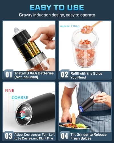 【ADJUSTABLE COARSENSESS】 Our electric salt or pepper grinder set just rotate clockwise to grind into fine grains and counterclockwise to grind into coarse grains. You can easily adjust the coarseness of spices according to your preference.