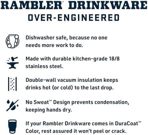 The Rambler 20 oz. is made from durable stainless steel with double-wall vacuum insulation to protect your hot or cold beverage at all costs