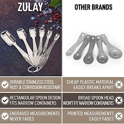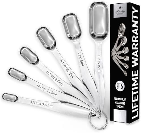 SMART AND THOUGHTFUL DESIGN: These measuring spoons feature slim, rectangular spoon-heads and long handles that can easily fit into narrow spice jars, bottles, and containers to scoop ingredients without spillage. The easy-to-open clasp allows you to use the spoons individually instead of taking the entire bunch. The stackable design lets you save space.